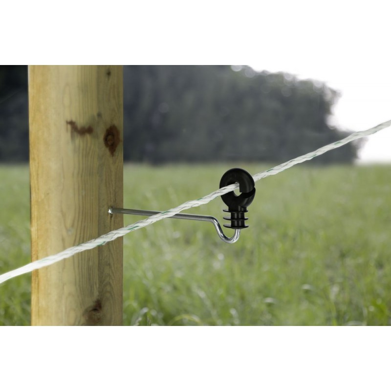 Distanční kruhový izolátor pro dráty a vodivá lanka. Je osazený vrutem pro rychlé a dobré upevnění na dřevěné kůly.